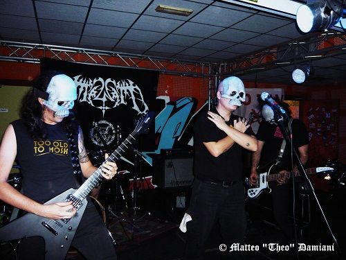 E così arriva il momento dei bolognesi MALNATT, headliner della serata. Si presentano con le loro maschere da teschio per dare un tocco macabro all’esibizione e scatenano subito l’inferno con la potenza del loro originalissimo black metal che ha ormai abbandonato le influenze folk degli inizi. Portano sul palco del Pagan Størm Fest soprattutto l’ultima fatica, “Principia Discordia” (del 2012), di cui spiccano in particolare “Manifesto Nichilista” e “Don Matteo”. I brani, scanditi con potentissima precisione dalle pelli di Lerd, si alternano con gli ironici sproloqui di Porz, che continua a chiedersi come mai il pubblico non si sia ancora stufato e riesce a fare perfino uno scherzoso riassunto della serata definendo i primi due gruppi “tanti strumentini con cui si balla e si canta”, i Blaze Of Sorrow “capelli nella nebbia”, infine “gli Ulvedharr li ho visti da dietro” (aspettando nel camerino) e concludendo con il fatto che i Malnàtt si potevano tranquillamente evitare. Verso metà concerto tutti i membri si tolgono le maschere, per permetterci finalmente di vedere i volti dell’energico quartetto e soprattutto gli inconfondibili baffi di Porz. Nonostante voglia mandare tutti a casa, il pubblico non gli dà ascolto e si lancia in un pogo scatenato per continuare degnamente la serata, che si conclude con “Pornokrator” e con una soddisfazione generale.