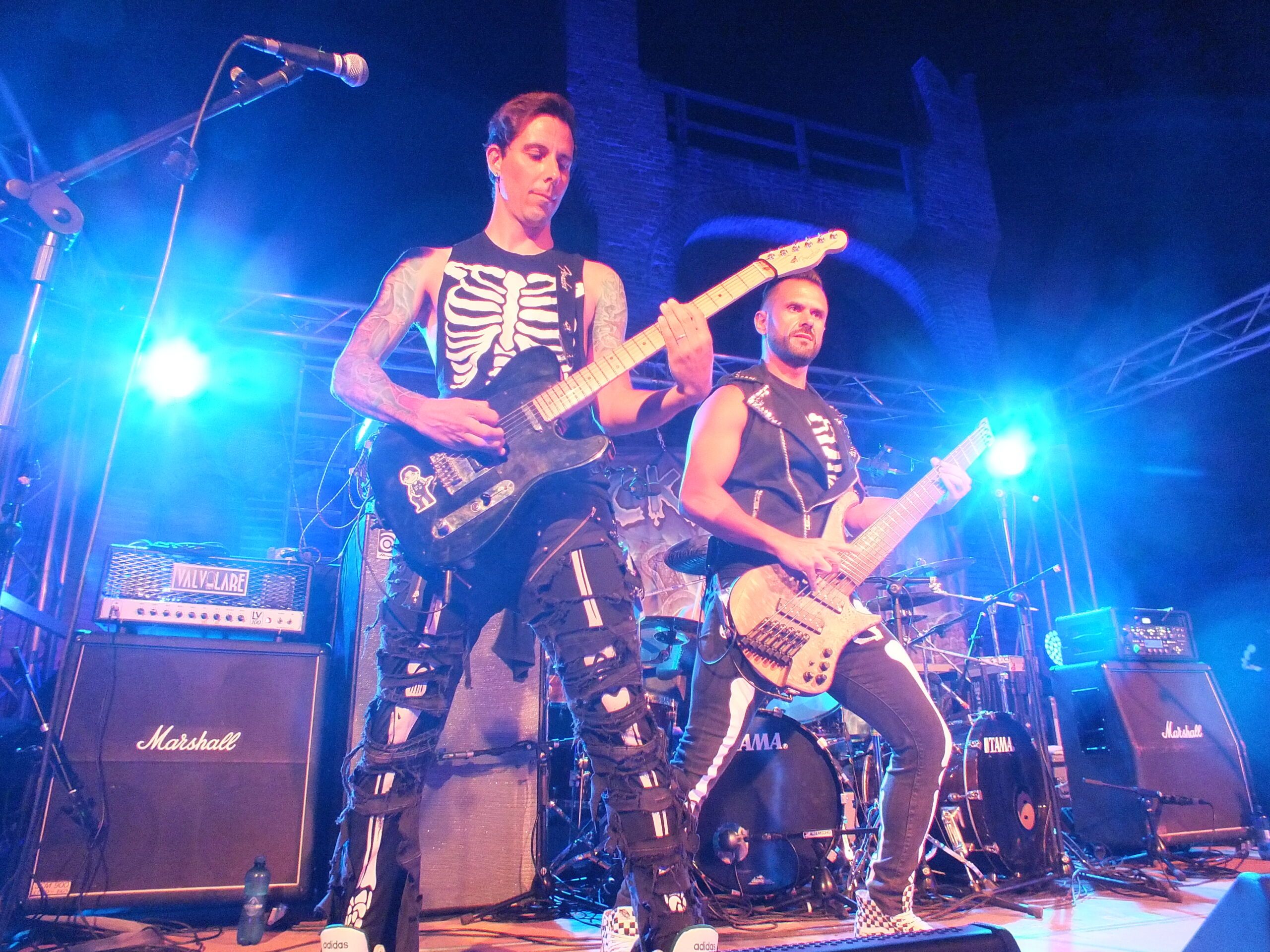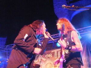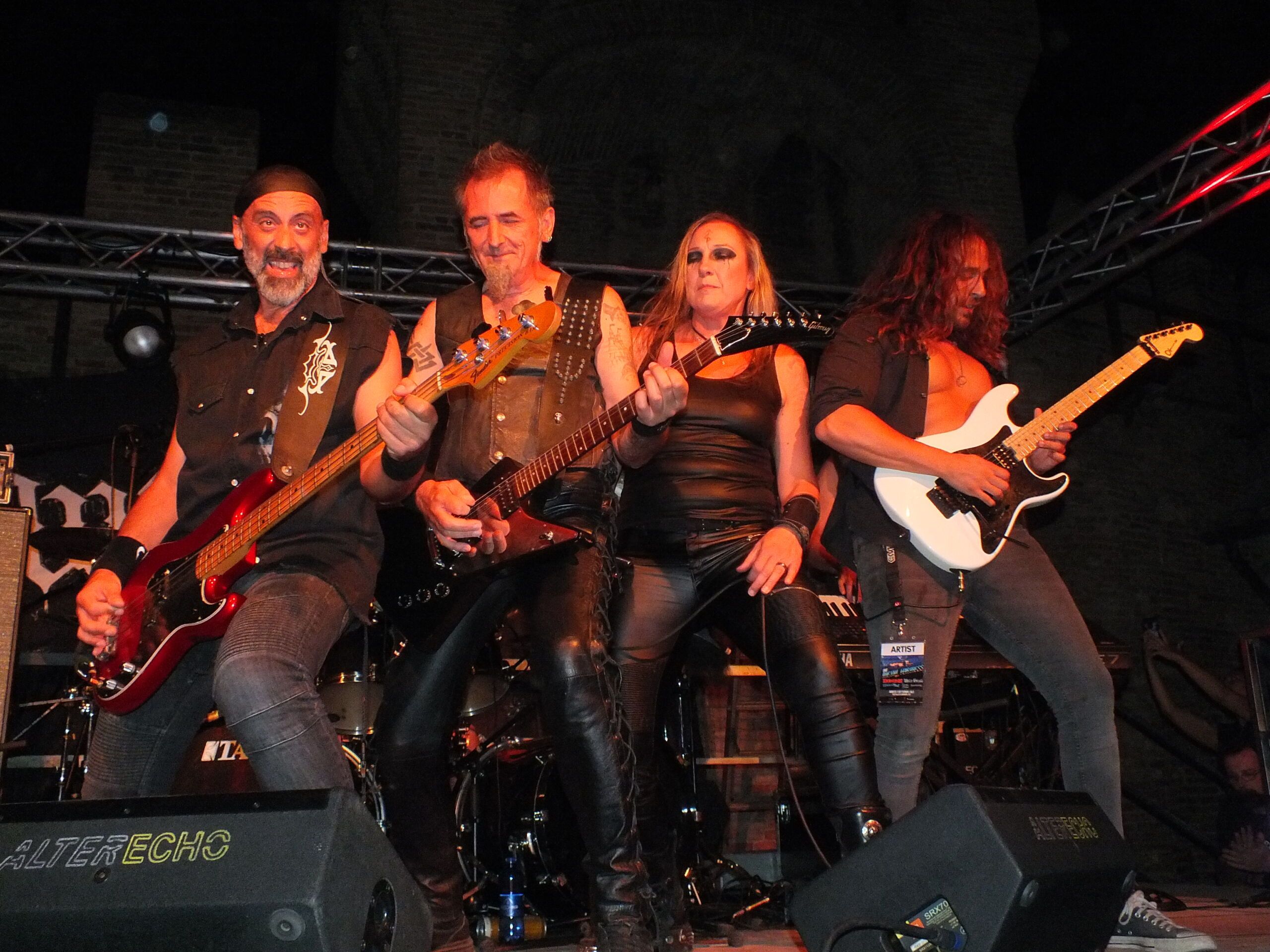 La durata del set per l’occasione si protrae leggermente rispetto ai due precedenti, al netto di un leggero ritardo che costringerà la band a rimuovere un brano dalla scaletta per consentire allo spettacolo di rimanere nei tempi consentiti. Poco male, poiché i Trick Or Treat riescono comunque ad animare il cortile del castello con un’accurata selezione dei loro brani più rappresentativi estratti da pressochè ciascun episodio discografico. La partenza è affidata alla combo “Creeping Symphonies/Hungarian Hangover” dall’ultimo album “Creeping Symphonies” edito quest’anno, seguite dalla coinvolgente “Acquarius” da “The Legend Of The XII Saints”.