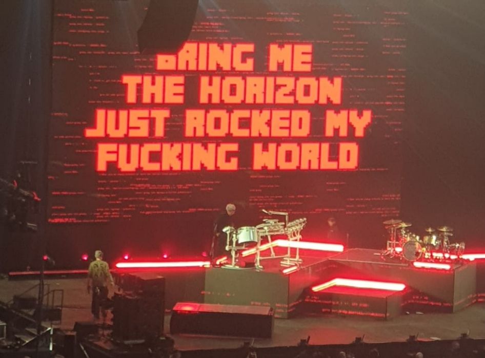 In ogni caso, via! Luci spente e la presentazione di un video: un’IA robotica si presenta a noi umani e ci ordina di creare un moshpit, dopodiché parte un conto alla rovescia e il palazzetto esplode quando, giunto allo 0, parte “Can You Feel My Heart”. Sono finalmente i Bring Me The Horizon!