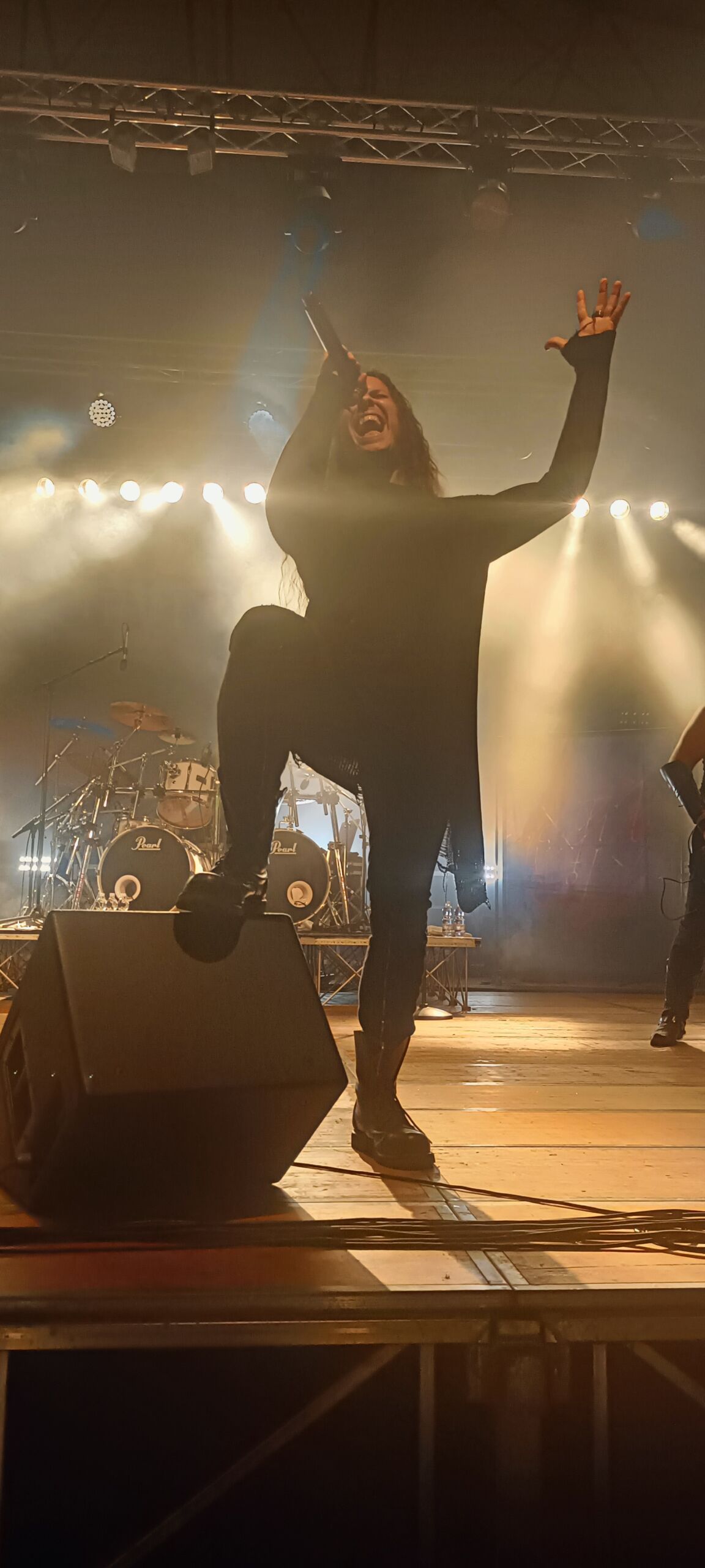 L’onere ma, considerata la loro bellezza, l’energia, la tecnica, il carisma e la maestria, soprattutto l’onore di aprire le danze e, se mai ce ne fosse stato bisogno, di scaldare il pubblico, è toccato alle carismatiche Hellfox, quartetto bergamasco femminile che avevo avuto il piacere di ascoltare nel 2022 in apertura del Metal For Emergency. Nate nel 2019 dall’unione della bassista / cantante growl Priscilla Poe, di quella macchina da guerra dietro alle pelli che risponde al nome di Fedy Piscopo, dell’ascia Gloria Kaps e della simpaticissima, eclettica, trascinante e bellissima cantante Greta Antico, si sono fatte notare sin da subito per il loro stile che miscela, molto sapientemente, gothic e death melodico con una letale alternanza di voci pulite e growl infernali ed assassine. La formazione sta terminando l’immenso tour che ha intrapreso dopo l’uscita, nel 2022, del meraviglioso CD di debutto The Call ed ha già terminato le registrazioni del suo successore, e tutti abbiamo già l’acquolina in bocca nella spasmodica attesa di poterlo ascoltare.