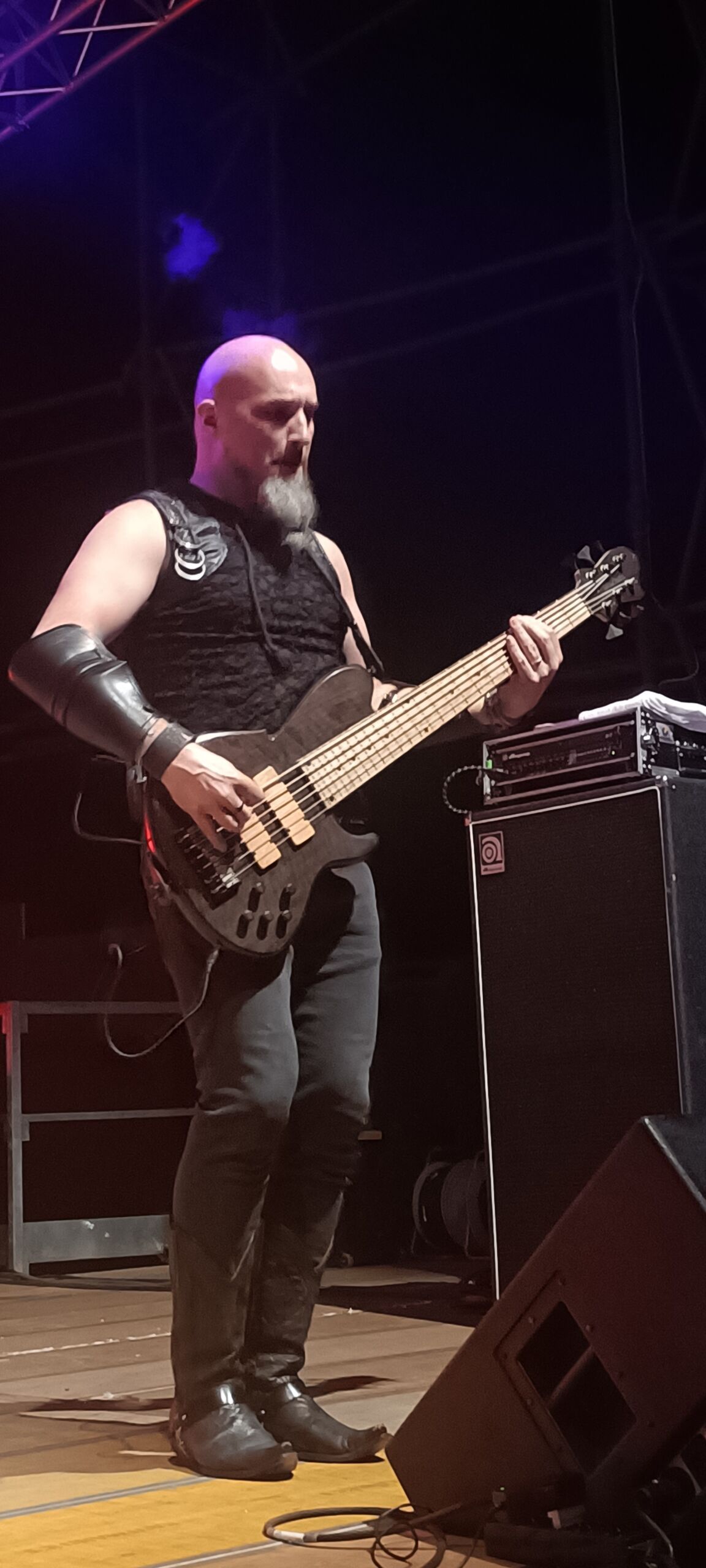 Ed ecco che, dopo un rapidissimo cambio di palco ed un altrettanto fulmineo soundcheck, sono saliti sul palco una delle autentiche icone del metal tricolore e non solo, sto parlando dei piemontesi Anthenora, band nata nell’A.D. 1989 e che da oltre trent’anni porta orgogliosamente il vessillo del metal più puro e senza fronzoli. Per dirla con una frase cara ai mitici Kiss “Take It Or Leave It”. E noi prendiamo con immensa gioia e ci lasciamo trascinare dallo tsunami sonoro che si scatena non appena la formazione sale sul palco. Il loro show è un concentrato di heavy old school che sembra un vero e proprio tributo ai “Metal Gods”, cominciando dai cori dell’intro e dal fumo che accompagna l’ingresso della band sul palco e continuando con il look del cantante Luigi Bonansea che indossa una giacchetta molto simile a quella di sua maestà Rob Halford ed ha il carisma ed il graffio vocale del mitico Tim “Ripper” Owens. Il tutto splendidamente quadrato dai maestosi, virtuosi e micidiali riff tessuti delle due asce Stefano Pomero e Gabriele Bruni e la titanica sezione ritmica splendidamente orchestrata dal basso di Samuele Peirano e dalla batteria di Fabio Smareglia.