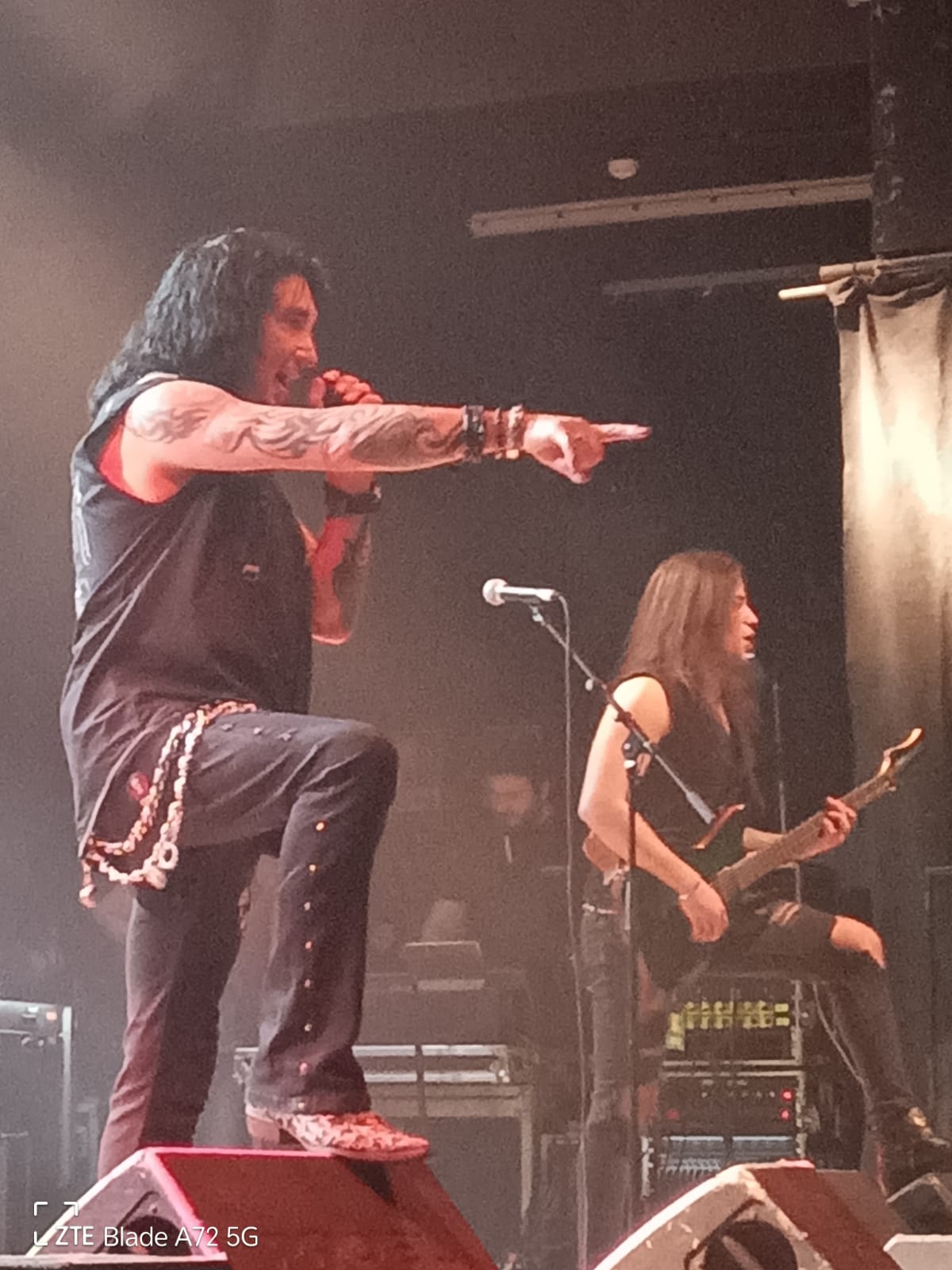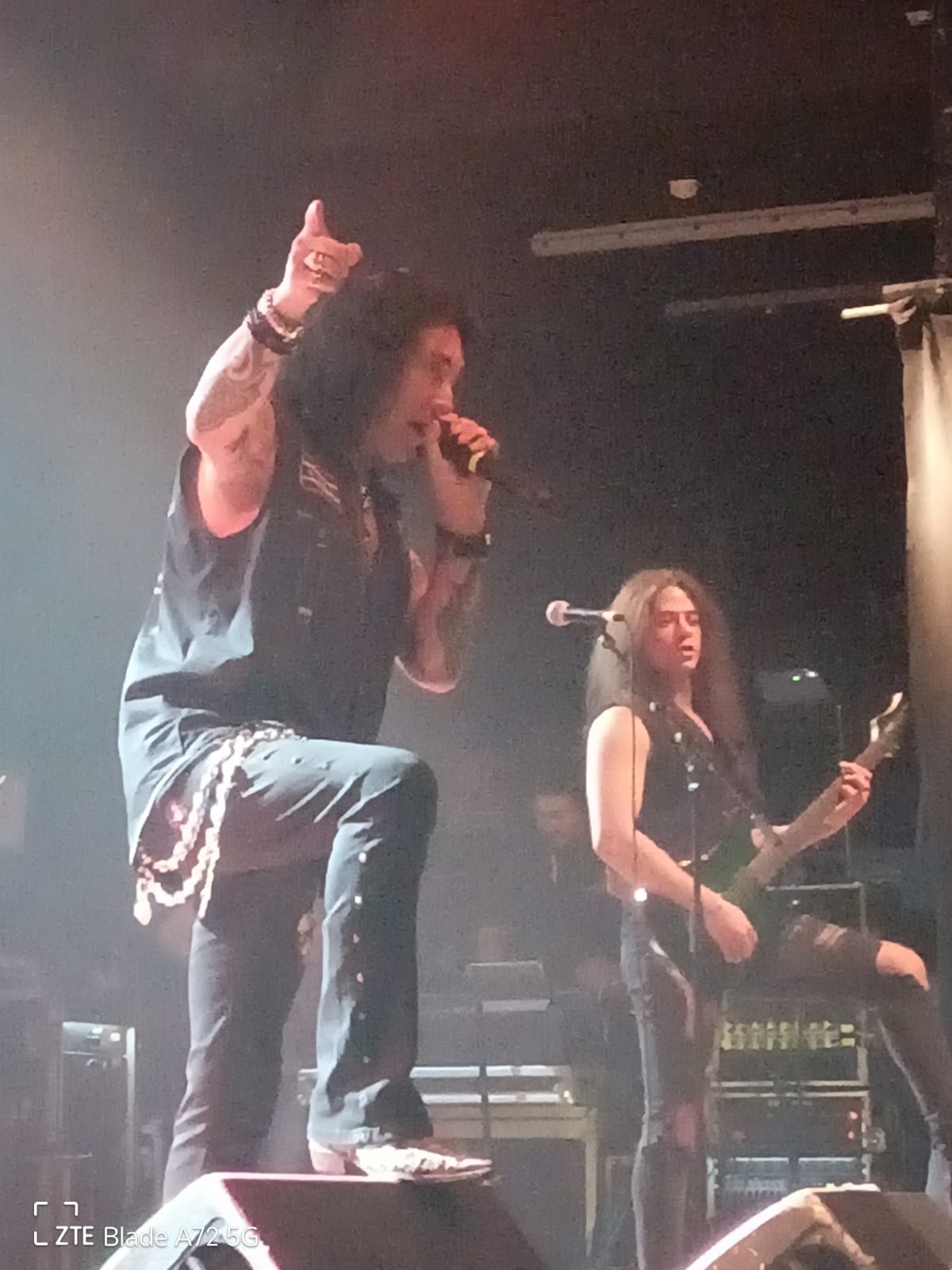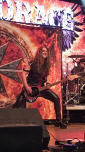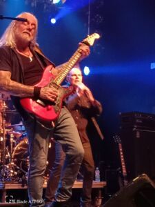 Il suo primo aneddoto della serata è un suo ricordo di quando venne l’ultima volta con i Krokus a Milano e ringrazia tutti per essere stasera qui ad ascoltarlo. Naturalmente la set list si concentra proprio sul materiale della vecchia formazione che suona praticamente allo stesso modo degli AC/DC, in poche parole una specie di clone europeo. Il primo colpo è la rapida e sfacciata “Midnite Maniac”, che Marc ha sempre adorato proporre dal vivo. Sinceramente le distorte chitarre elettriche e lo sdolcinato refrain fanno pensare più alle spiagge assolate della California che ai saltellanti canguri australiani. Quello che colpisce, a parte le sue ancora intatte e roche corde vocali, è la bravura degli artisti che suonano con lui. La bassista Emi Meyer non si ferma un minuto facendo avanti e indietro sul palco e sempre con il sorriso sulle labbra, ma lo stesso si può anche dire per il chitarrista solista Dom Favez che si sposta spesso vicino al pubblico per far ammirare i suoi virtuosismi chitarristici. Altri pezzi da novanta sono altre tre song dei Krokus: la battente e cadenzata “To The Top”, l’ambientale “Screaming In The Night” e la dura “Hellraiser”. Qui il Live Club si infiamma cantando i ritornelli appresso a Storace che gradisce e apprezza il sincero amore per queste pietre miliari senza tempo del genere. In particolare nella seconda, piace l’inizio solista della giovane e timida chitarrista inglese Anna Cara che insieme alla sezione ritmica innesca dei distorti riff su cui sopraggiunge la bassa e rauca voce del frontman. La gente percepisce l’amore e la passione del vocalist e batte le mani durante l’esecuzione della bluseggiante e cadenzata “Hellraiser”, altra mitica e leggendaria canzone dai suoni spigolosi e aggressivi. Come la maggior parte degli artisti di questa edizione, anche il buon Marc si presta ad un duetto con il fenomenale Ronnie Romero interpretando la conosciuta e roccheggiante “American Woman” dei canadesi The Guess Who, risalente al 1970 e già ripresa dai Krokus su One Vice At A Time nel 1982. A mio avviso scelta sbagliata perché Ronnie è di due spanne superiore a Storace e la cosa si nota immediatamente soprattutto nelle parti più alte del pezzo. A parte questa piccola pecca che si poteva benissimo evitare, il concerto si conclude con l’ennesimo brano dell’ex band di Storace, ovvero la vivace e trascinante “Rock’n’Roll Tonight”, dotata di adrenalinici riff di chitarra e di quegli inconfondibili ritornelli e cori tipici degli intramontabili e ancora amati AC/DC che non lasciano indifferenti un pubblico pronto ad alzare le mani in alto e a saltare sul posto. A parte il mal riuscito duetto con l’inarrivabile cileno, quello che forse ha stonato in questi settanta minuti, sono le pause troppe lunghe tra un pezzo e l’altro in quanto i musicisti escono spesso dal palcoscenico per dissetarsi e riposarsi. Per il resto e in generale si può parlare di una discreta esibizione dove si ode piacevolmente la ruvida e grintosa ugola di Storace attorniato da una formazione molto interessante che versa sul palco tanto sudore ma trasmette anche tanta allegria.