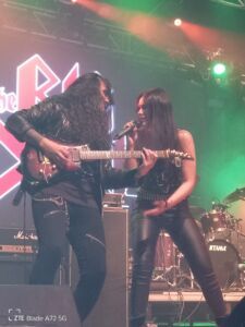 “Oltre le gambe c’è di più” cantava qualcuno, ma non ditemi chi perché sicuramente non fa parte del mio repertorio musicale. Questa frase e questa specie di canzone mi vengono in mente e all’improvviso nel momento in cui vedo la sexy vocalist Ana e l’affascinante cantante e tastierista Nevena dei The Big Deal preparare gli strumenti dietro il momentaneo sipario, calato per l’occasione per dare il tempo al nuovo gruppo di prepararsi. Queste due bellissime ragazze fanno la loro gran figura non solo fisicamente, ma soprattutto a livello artistico perché sono veramente preparate. Il fidato Luca finalmente si fa vivo dalle mie parti per curiosità e per immortalare queste due belle musiciste con la sua macchina fotografica . La bionda Nevena, moglie del chitarrista Srdjan Brankovic e la bruna Ana tengono in scacco sensualmente la parte maschile della platea che da lì a qualche minuto le apprezzerà, insindacabilmente per la loro buona interpretazione. L’iniziale e tagliente “I Need Your Here Tonight” apre le danze, ma con l’handicap dei suoni non ancora ben bilanciati. La chitarra elettrica e la sezione ritmica in certi momenti sovrastano l’ugola bassa di Ana e quella di Nevena che con la sua possente voce e la sua keytar rossa a tracolla riesce comunque a mettersi in evidenza con intricati e complessi assoli tastieristici. Quello che conta alla fine è la musica e questo brano non delude affatto perché infiamma da subito tutti i presenti con la sua imponente introduzione di tastiera, che strizza l’occhio al metal sinfonico, e con il suo canticchiabile ritornello. Il ritmo è alto e trascinante grazie anche alle abilità artistiche del chitarrista Srdjan Brankovic, veterano della scena musicale serba grazie alla sua militanza in gruppi come gli Alogia e gli Expedition Delta. La sei corde elettrica si intreccia benissimo con la tastiera facendo a gara negli assoli ultra-melodici profusi da entrambi gli strumenti che gareggiano ad armi pari. Nella seconda “Better Than Hell”, sembrano in parte risolti i problemi al microfono ed Ana comincia ad interagire di più con il pubblico e con la sua stessa band. La successiva “Wake The Fire” è il marchio di fabbrica di un gruppo che presenta robustezza, tecnica e un eccezionale assolo di chitarra elettrica che fa sussultare gli amanti della sei corde. Qui Nevana abbandona momentaneamente la sua keytar per suonare la sua tradizionale tastiera e sviluppare articolati e particolarissimi assoli. I momenti clou dello show sono comunque gli ultimi due cavalli di battaglia dei serbi, ovvero “Never Say Never” estrapolata dal primo disco First Bite e “Survivor” pescata dall’ultimo Electrified. La prima è un galoppante hard rock ben riuscito soprattutto per l’interessante intreccio di chitarra, sintetizzatore e cori che infiammano l’anima anche grazie ai magici tasti della Nevena. La seconda è un pezzo cadenzato e atmosferico, dove la melodica e la sottile ugola di Ana si adattano benissimo ad un coinvolgente e accattivante ritornello che si pianta immediatamente in testa senza uscirne più. Siamo alla fine e si ha l’impressione che il tutto sia filato troppo in fretta e velocemente. L’hard rock ottantiano, mieloso ed energico dei serbi fa breccia tra gli spettatori con leggere e vivaci canzoni hard rock che portano allegria e spensieratezza. Quindi, oltre alla bellezza e all’apparenza fisica c’è tanto di artistico nei The Big Deal che vengono salutati meritatamente e a furore di popolo. Ci vorrebbe un bis, ma anche stasera siamo in ritardo di qualche minuto e bisogna correre.