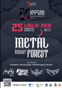 All’interno del Kaptura Festival torna il “Metal Midnight Forest“, organizzato da Nadir Music in collaborazione con “Fondazione Monferrato On Stage”, parte del progetto SNODI finanziato dal Ministero della Cultura e dal Programma PNRR con obiettivo “valorizzazione e promozione culturale e territoriale”.