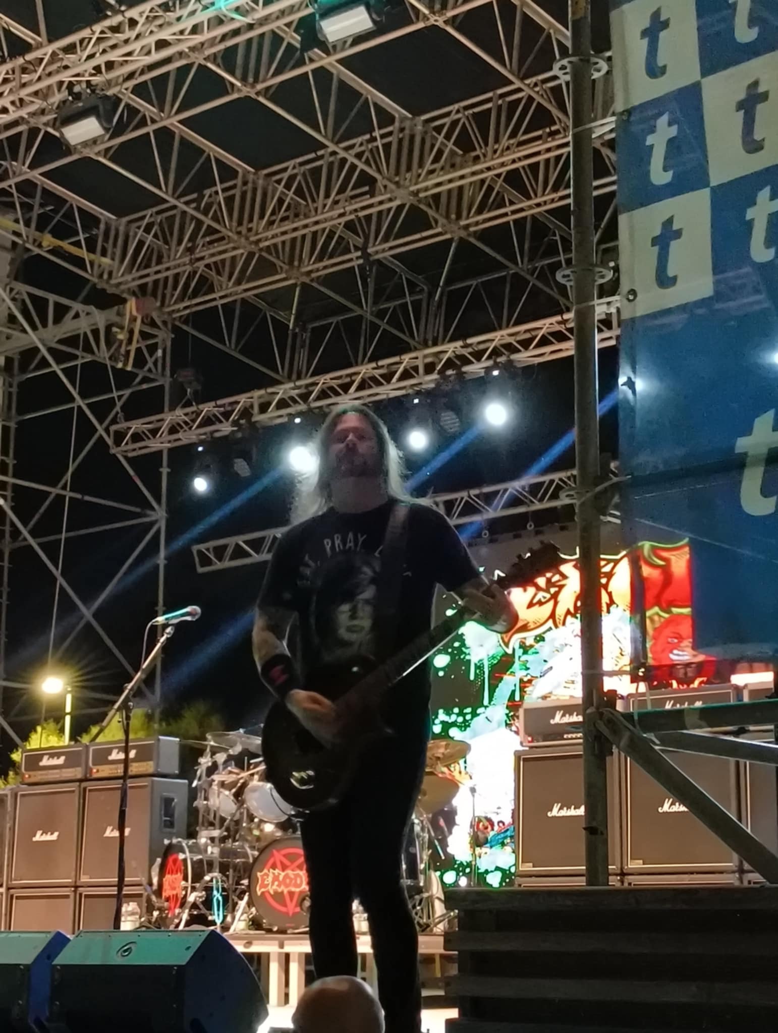 Sugli scudi Gary Holt con la sua maglietta provocatoria (la scritta “Eat, Pray, Love” sopra il volto di Jeffrey Dahmer), e Lee Altus, impeccabile come sempre. In disparte, il fedele Jack Gibson, in formazione dal 2001, accompagna con precisione il martello dietro le pelli: Tom Hunting, membro storico e fondatore (assieme al celebre Kirk Hammett!).