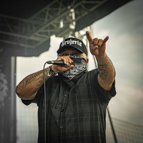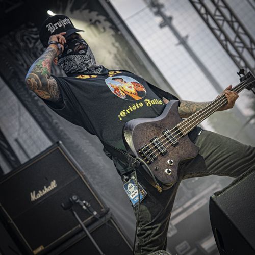 ¡Vatos! Scherzare, per i Brujeros, è una cosa seria! Con questa superband ultratrentennale non sai mai chi ci troverai dietro le bandanas che coprono i volti. Oggi abbiamo trovato un tesoro di energia e brutalità. Per chi non lo sapesse, raccontano a tutti di essere una gang di trafficanti messicani e, sotto questo travestimento che gli permette tutta la cattiveria di ‘sto mondo e quell’altro, irridono i potenti (giusto un Trump… un Pablo Escobar…), i privilegiati, i classisti con un chiaro discorso politico nostalgico-rivoluzionario, spesso iperbolico e di protesta celata da adulazione. Hanno ironia da vendere ma non mollano mai l’aria da duri. Il suono spesso sfiora lo Skate Punk ma mantiene la rotta del Death, il dinamismo sul palco è altissimo. Basso pauroso. Non c’è traccia degli scherzi musicali che, qualche volta, stupiscono chi ascolta i loro dischi (ragazzi, “Don Quijote Marijuana” vi farà cascare la mutanda!). A parte la registrazione trasmessa in chiusura della “Macarena” rivisitata, anche questa al gusto di “ingredienti naturali”. El Sangron cerca il pubblico continuamente, come se fossero compratori del suo spaccio. Il suo è un ritorno al centro del palco e fa un ottimo lavoro nel riempire il vuoto lasciato da El Brujo, che è andato a spingere i papaveri da sotto da circa un anno e viene omaggiato con affetto. Ci siamo veramente divertiti. E ci hanno fatto pensare che essere peones è un problema di ingiustizia. ¡Que viva la brujeria!