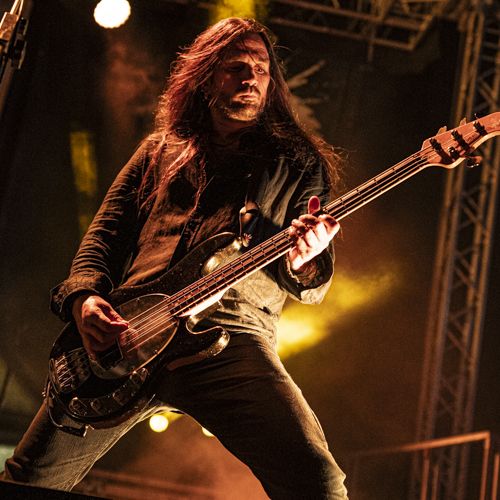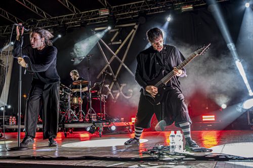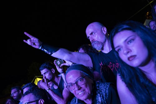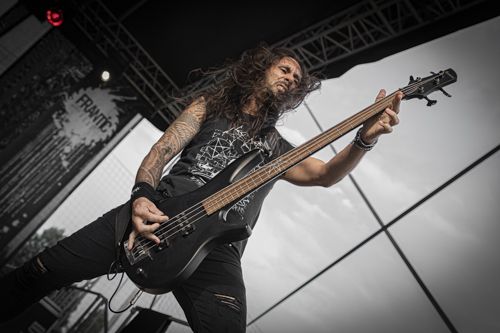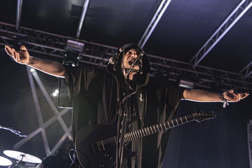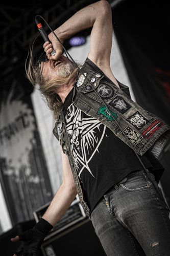 I primi a salire sul palco principale lo fanno con una enorme carica di emozione e passione. I Necrodeath compiono 40 anni di carriera e vogliono chiudere su questo numero tondo, sarà l’ultimo tour. E come chiudono! Quattordici LP, di cui l’ultimo, Arimortis, appena uscito, non hanno rallentato questi thrashers mortiferi che offrono una lezione magistrale di gestione del palco e di trazione musicale. Mi confidano che qualche settimana fa la scaletta era stata aggiustata per evitare eccessi di velocità. Oggi niente di tutto questo, questi Signori del Rock si rifanno ai suoni più classici, alle distorsioni con le quali abbiamo risonato fin da piccoli, ma mai scontati e, giustamente, amatissimi dal pubblico. Peso, il batterista, è membro fondatore, basso (GL) e chitarra (Pier Gonella) risalgono a questo millennio, Flegias, il cantante, ha preso il testimone nel ’98. Ma è ovvio come la tradizione sia stata tramandata. Flegias, prima del concerto, è incuriosito dal diavoletto che decora la mia macchina fotografica. Ho il piacere di donarglielo come portafortuna per i prossimi 40 anni di musica che Di…avolo gli possa concedere!