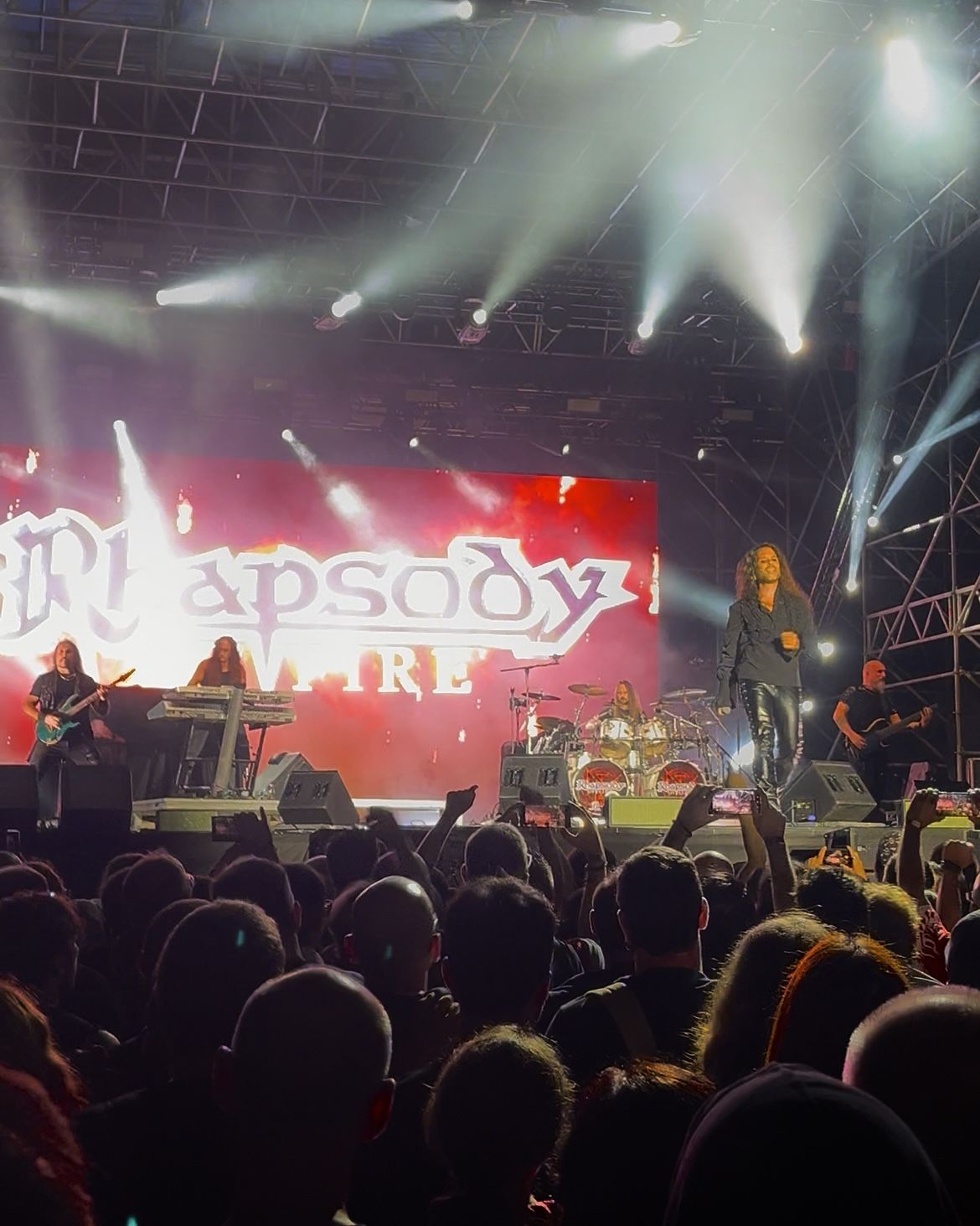 Al Metal Park 2024 sono riuscito a vedere i Rhapsody Of Fire solo sull’ultimo ritornello dell’ultimo brano, complice un po’ di coda all’ingresso, quindi sono ansioso di vederli a questo Metal Gate. Si parte con “Unholy Warcry” che mi riporta indietro a quando li vidi per la prima volta a Francoforte in apertura ai Manowar – la formazione era leggermente diversa. La reazione del pubblico è lesta e gli astanti non si fanno pregare: il ritornello è cantato a squarciagola da tutti. Questo è il riassunto che si potrebbe fare per ogni brano suonato nel set. I Rhapsody Of Fire non perdono un colpo e per nostro sollievo i suoni sono bellissimi. La chitarra di De Micheli c’è, non salta e non sovrasta e durante le parti in duetto con Staropoli i livelli sono perfetti, quasi in qualità disco. La commistione dei suoni del basso di Alessandro Sala e della batteria di Paolo Marchesich è ineccepibile e si lasciano spazio a vicenda in modo tale da essere entrambi udibili chiaramente. Il “woooooo” è magicamente sparito. Giacomo Voli è padrone della scena; gli bastano due parole e qualche movimento di braccia per catturare l’attenzione e la partecipazione del pubblico, caldissimo. Le sue doti vocali sono indiscusse e la resa è perfetta sui brani nuovi e su quelli vecchi. Sulla setlist c’è poco da dire, in realtà: metà scaletta affidata agli ultimi tre dischi (The Eighth Mountain, Glory For Salvation, Challenge The Wind) con brani che vengono cantati da tutti i presenti e l’altra metà affidata ad album dall’epoca pre-Of Fire, sempre con la collaborazione vocale di tutti gli astanti. “Dawn Of Victory” ed “Emerald Sword” in chiusura sono un trionfo di metal epico eseguito con tutti i crismi del caso. Bravi Rhapsody Of Fire!