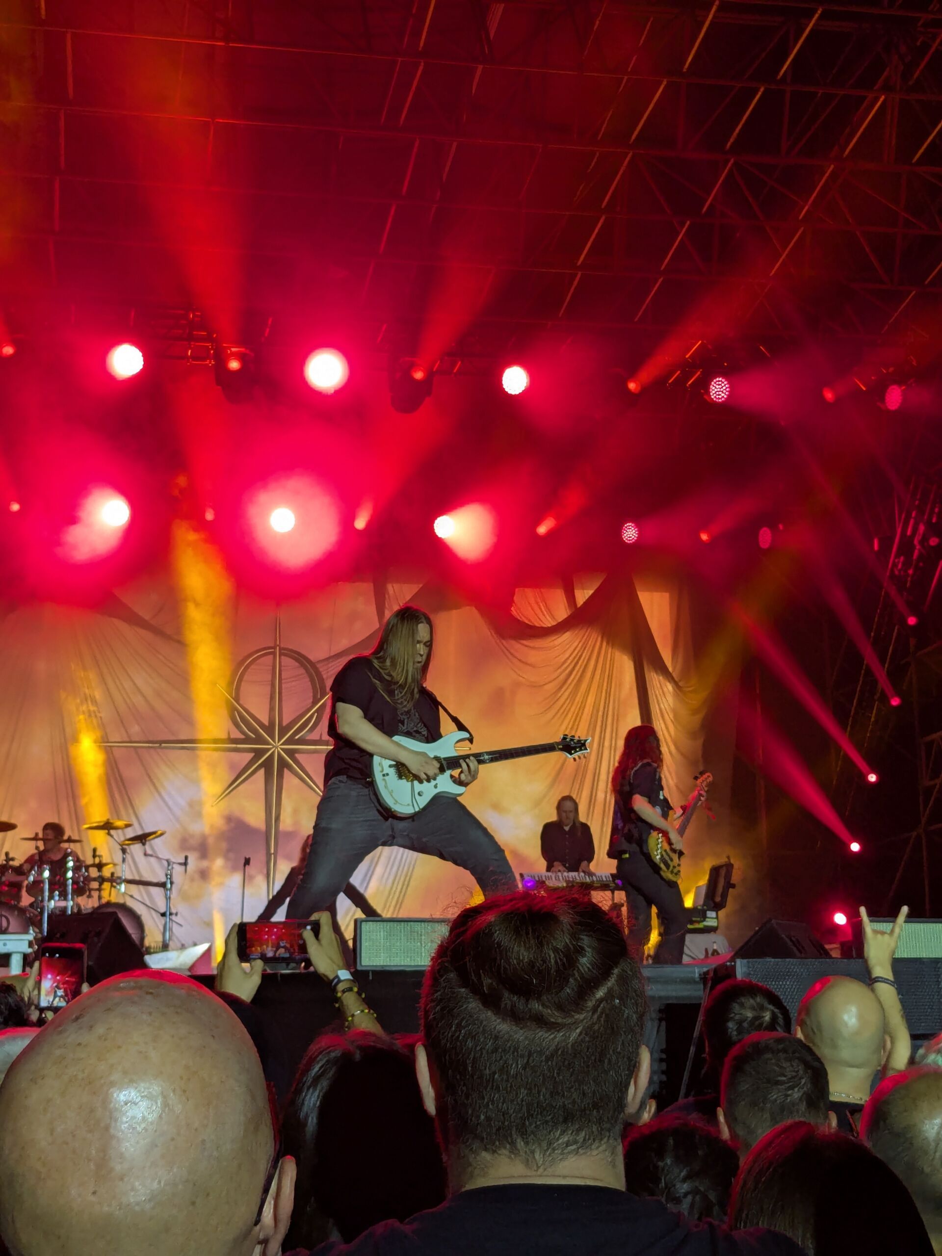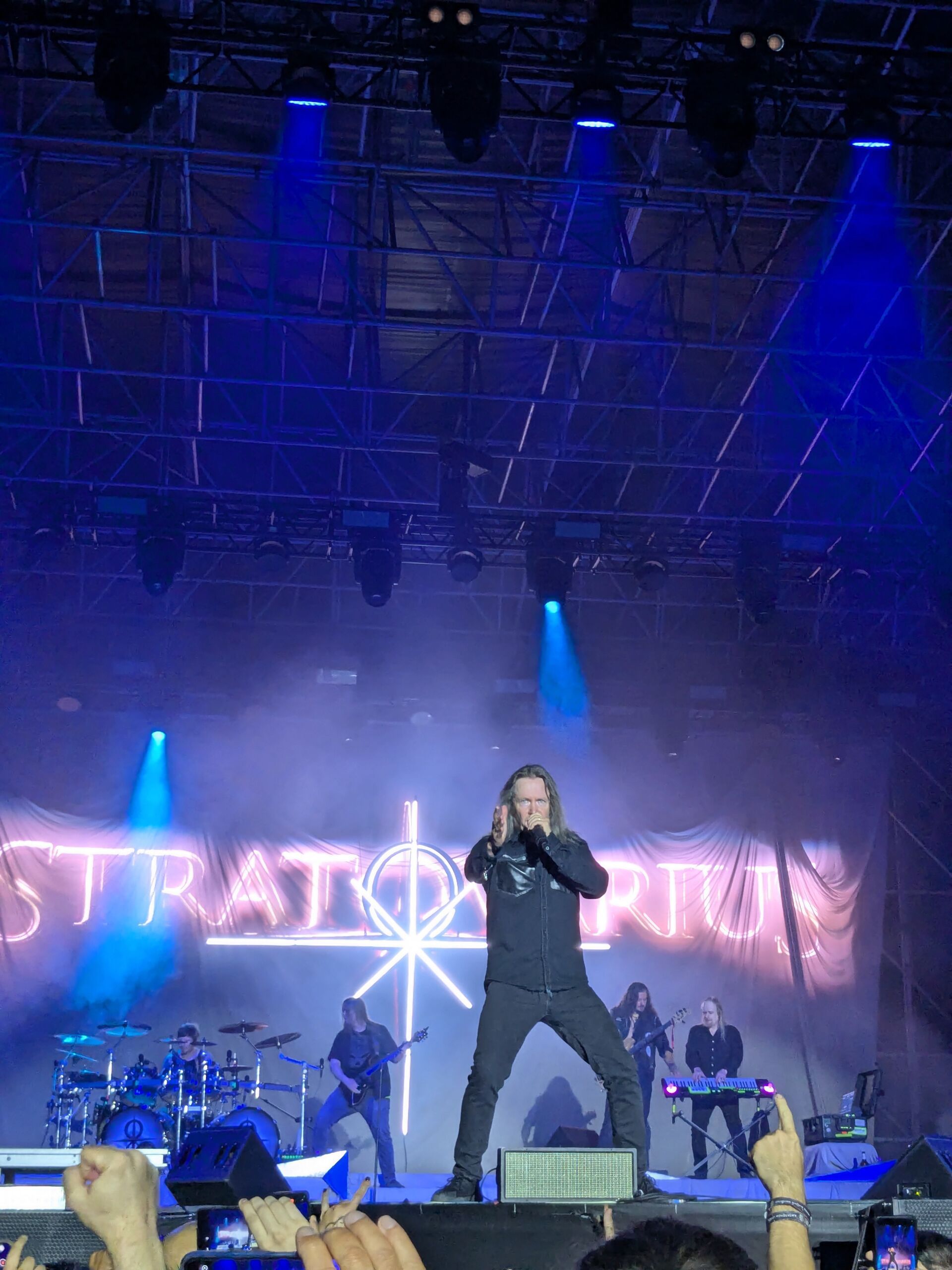 Si sa, gli Strato sono una garanzia, ma, nonostante siano passati due anni, come al Metal Park 2024 si sente che arieggia lo spettro di Milano 2023 dove la sfortuna ha colpito pesantemente Timo Kotipelto e soci. Per fortuna quell’incidente è ormai lontano. Intro e si parte a 1.079.252.848,8 km/h: “Speed Of Light”. Veloce, precisa e immortale. I suoni raggiungono l’apice. Raramente ho sentito questa band in maniera così cristallina. Per non tediare chi legge eviterò l’analisi strumento per strumento e mi limiterò a sottolineare come gli Stratovarius si siano presentati sul palco con amplificatori veri, niente digitale e la differenza è stata abissale. La scaletta prosegue con “Eagleheart”, “Glory Days” e “Kiss Of Judas”, senza un attimo di tregua. La band è in trance agonistica, con Matias Kupiainen che inanella assoli dal gusto musicale superbo – per i “guitar nerd”, i pezzi vecchi in Re li ha suonati con la chitarra in drop! -, Jens Johansson calmissimo che beve una Moretti da 66cl mentre con l’altra mano suona – se Jens non beve, non è un live degli Stratovarius – e incastra ritmiche meravigliose con il bassista Lauri Porra, forse vero protagonista scenico di questa serata. Menzione speciale per Rolf Pilve, perché prendere in mano l’eredità di Jorg Michael non è facile; se suoni i brani uguali allora risulti la fotocopia, se li cambi stai tradendo gli originali. Rolf invece ci mette il proprio gusto musicale senza dimenticarsi chi suonava prima di lui e quindi i classici della band sono fedeli agli originali, con il suo tocco personale che non li snatura, anzi, li esalta. Infine Timo Kotipelto; che gli vogliamo dire? Voce perfetta, doti da intrattenitore che migliorano con l’età e tanta tanta felicità nel vedere il pubblico di Marina di Altidona che perde la voce con i suoi classici intramontabili. Arriva “Survive” dall’omonimo ultimo album. Già mi era piaciuta a Wacken 2022 quando la presentarono in anteprima e ora che è un brano rodato devo dire che si inserisce perfettamente nella scaletta senza sfigurare di fronte ai giganti del passato. Qualcuno ha detto “Black Diamond”? Eccola! Servita con un antipasto di assolo di tastiera, scatena un pogo sfrenato e un canto collettivo che quasi copre il volume dell’impianto. Da qui in avanti l’adrenalina sale ancora di più. “Destiny” e “Unbreakable” preparano il terreno per il finale ormai rituale affidato ad “Hunting High And Low”. Bella, come la prima volta che la sentimmo dal disco di Infinite. Potrebbero suonarla quattro volte in scaletta e saremmo comunque tutti felici. Un concerto davvero spettacolare che chiude questa giornata dedicata al power metal, una tipologia di giornata che, ammettiamolo, dovrebbe verificarsi più di frequente nel nostro paese.